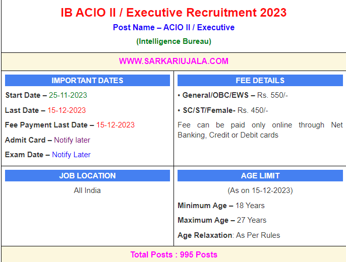 Post Description – MHA IB Intelligence Bureau is inviting online applications for IB ACIO II / Executive for 995 posts. Interested people meet all the eligibility criteria, apply online Details Of Recruitment Of MHA IB ACIO II / Executive Online Form 2023Posts Name – IB ACIO II / Executive Number Of Posts – 995 Posts Category Wise Posts – General – 377 Posts OBC – 222 Posts SC – 134 Posts ST – 133 Posts EWS – 129 Posts Pay Scale – Rs.44,900 –1,42,400/- Education Qualification – Bachelor Degree in Any Stream in Any Recognized University in India. How to Apply Online MHA IB ACIO II / Executive Online Form 2023 – Candidates can apply through link provided below or they can also apply through official site of the Intelligence Bureau before 15/December/2023. Required Documents For Online Application – Educational Mark sheet And Certificates Aadhar Card / Pan Card Passport Size Photo Signature Selection Mode – CBT Exam Interview Merit List