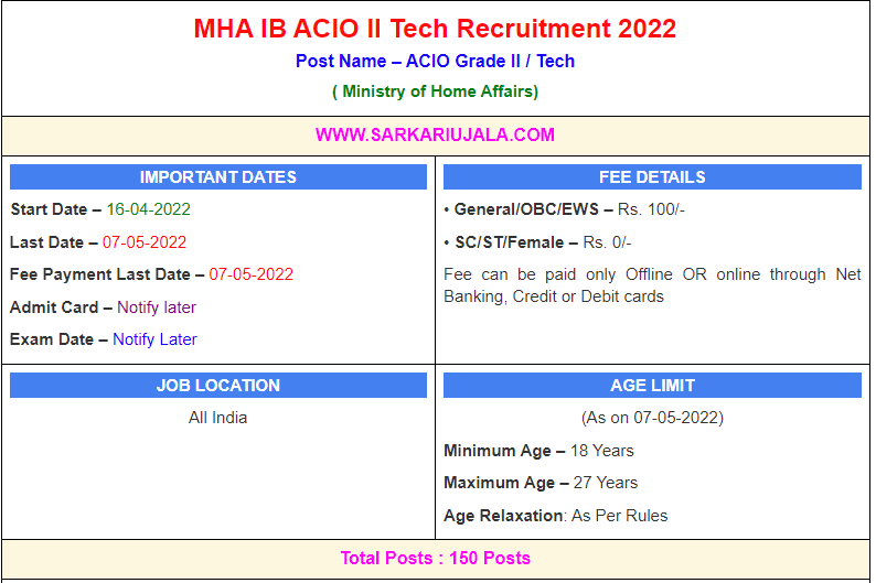 Post Description –MHA Ministry of Home Affairs is inviting online applications for ACIO Grade II / Tech for 150 posts. Interested people meet all the eligibility criteria, apply online Details Of Recruitment Of MHA IB ACIO II Tech Online Form 2022Posts Name – ACIO Grade II / Tech Number Of Posts – 150 Posts Category Wise Posts – Computer Science & Information Technology – 56 Posts General – 30 Posts OBC – 06 Posts SC – 08 Posts ST – 06 Posts EWS – 06 Posts Electronics & Communication – 94 Posts General – 50 Posts OBC – 09 Posts SC – 16 Posts ST – 10 Posts EWS – 09 Posts Pay Scale – Rs.44900 – 1,42,400/- (Level 7) Education Qualification – Score Card Of GATE 2020,2021,2022 AND BE / B.Tech Degree in Electronics / Electronics & Telecommunication / Electronics & Communication / Electrical & Electronics / Information Technology / Computer Science / Engineering OR Master Degree in Science with Electronics OR Physics with Electronics / Electronics & Communication / Computer Science/ Computer Application. How to Apply Online MHA IB ACIO II Tech Online Form 2022 – Candidates can apply through link provided below or they can also apply through official site of the MHA Ministry of Home Affairs before 07/May/2022 Required Documents For Online Application – Educational Mark sheet And Certificates Aadhar Card / Pan Card Passport Size Photo Signature Selection Mode – Shortlist Interview Final Merit List