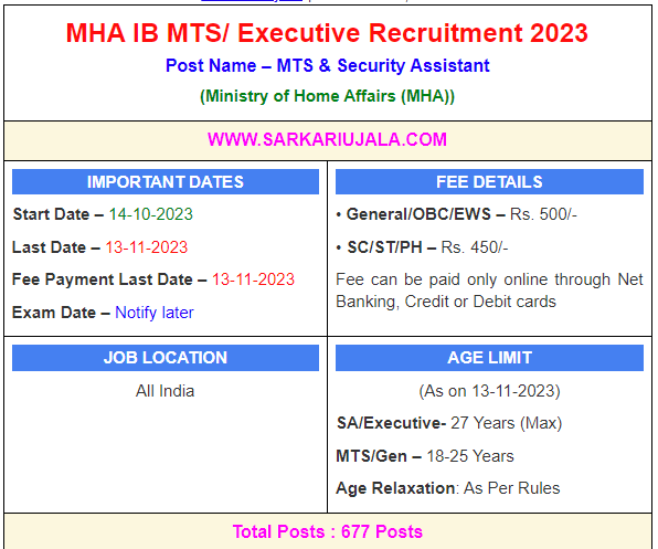 Post Description – MHA Ministry of Home Affairs is inviting online Applications for Security Assistant/Motor Transport and MTS for 677 posts. Interested people meet all the eligibility criteria, apply online Details Of Recruitment Of MTS & Security Assistant Online Form 2023Posts Name – MTS & Security Assistant Number Of Posts – 677 Posts Category Wise Posts – Security Assistant/Executive – 362 Posts MTS/General – 315 Posts Pay Scale – Security Assistant – Rs. 21700 – 69100/- (Level 3) MTS – Rs. 18000/- – 56900 /- (Level 1) Education Qualification – MTS – 10th Passed & Knowledge of Local language. SA/MT – 10th Passed And LMV Driving License And 1 Yr. Driving Exp. How to Apply Online MHA IB MTS And SA Online Form 2023 – Candidates can apply through link provided below or they can also apply through official site of the Ministry of Home Affairs (MHA) before 13/November/2023. Required Documents For Online Application – 10th Mark sheet And Certificates Domicile Certificate Aadhar Card / Pan Card Passport Size Photo Signature Selection Mode – Tier I CBT Exam Tier II Exam Interview Merit List | |||||