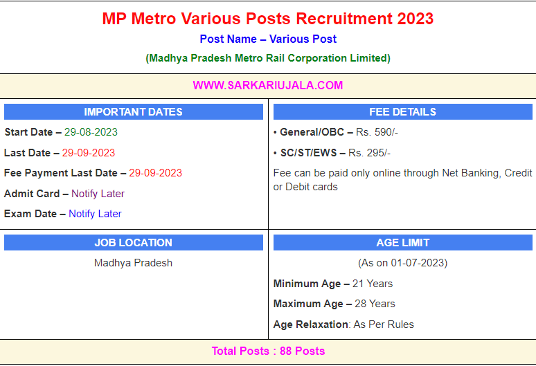 IMPORTANT DATESStart Date – 29-08-2023 Last Date – 29-09-2023 Fee Payment Last Date – 29-09-2023 Admit Card – Notify Later Exam Date – Notify Later | FEE DETAILS• General/OBC – Rs. 590/- • SC/ST/EWS – Rs. 295/- Fee can be paid only online through Net Banking, Credit or Debit cards | ||||