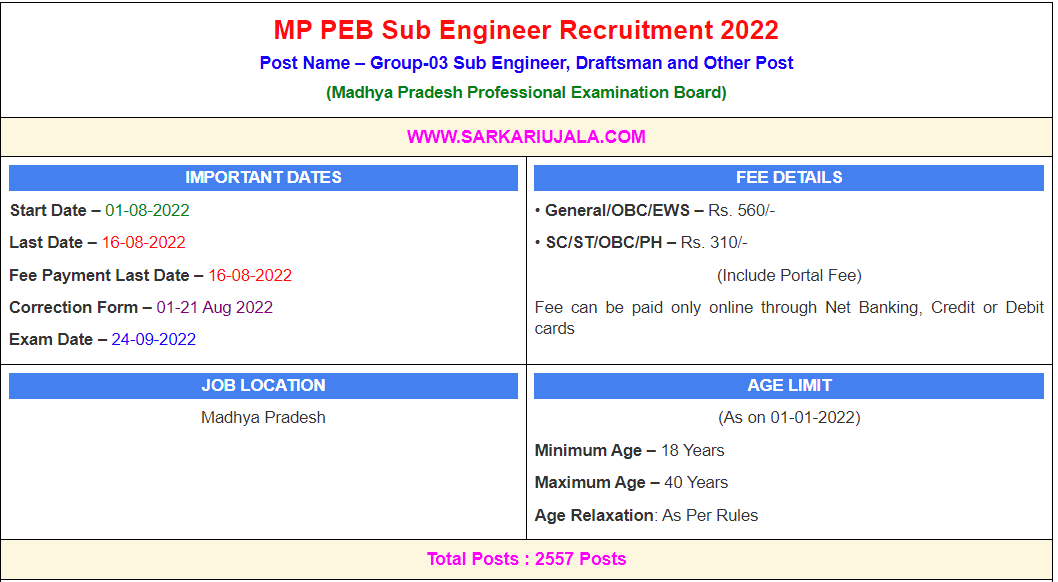 MP PEB Sub Engineer Recruitment 2022Post Name – Group-03 Sub Engineer, Draftsman and Other Post(Madhya Pradesh Professional Examination Board) | |||||