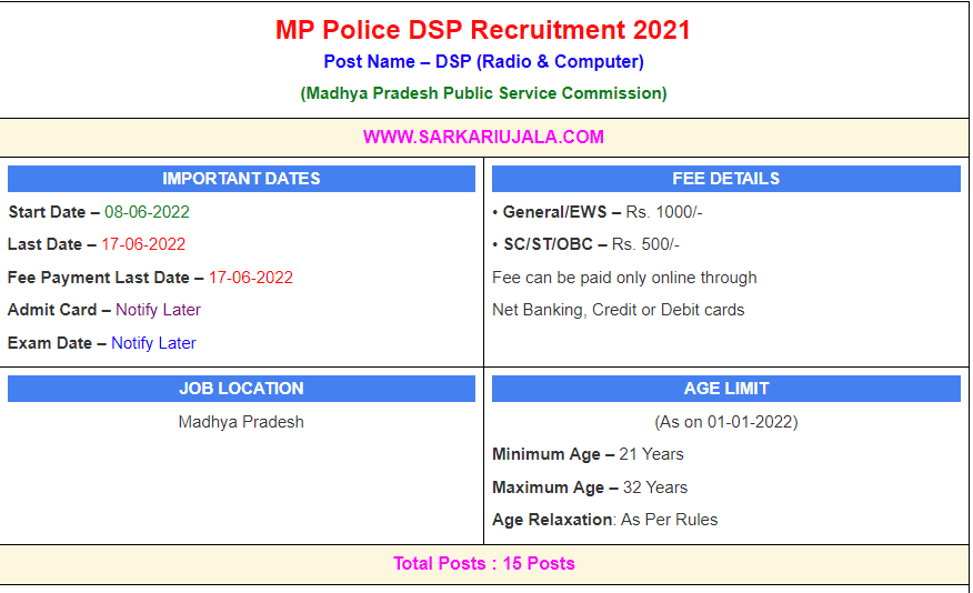 Post Description –Madhya Pradesh Public Service Commission is inviting online applications for DSP (Radio & Computer) for 15 posts. Interested people meet all the eligibility criteria, apply online Details Of Recruitment Of MP Police DSP (Radio & Computer) Online Form 2021Posts Name – DSP (Radio & Computer) Number Of Posts – 15 Posts Category Wise Posts – DSP (Radio ) – 13 Posts General – 05 Posts OBC – 04 Posts SC – 03 Posts ST – 04 Posts EWS – 01 Posts DSP (Computer) – 02 Posts General – 01 Posts OBC – 01 Posts SC – 0 Posts ST – 0 Posts EWS – 0 Posts Pay Scale – Rs.56100 – Rs. 177500/- Education Qualification – DSP (Radio)- Bachelor Degree in Technology OR Engineering In Electronics/Telecommunication . DSP (Computer)- Bachelor Degree in Technology/ Computer Science How to Apply Online MP Police DSP (Radio & Computer) Online Form 2021 – Candidates can apply through link provided below or they can also apply through official site of the Madhya Pradesh Public Service Commission before 04/Aug/2021. Required Documents For Online Application – Educational Mark sheet And Certificates Aadhar Card / Pan Card Passport Size Photo Signature Selection Mode – CBT Examination Interview Skill Test Final Merit List
