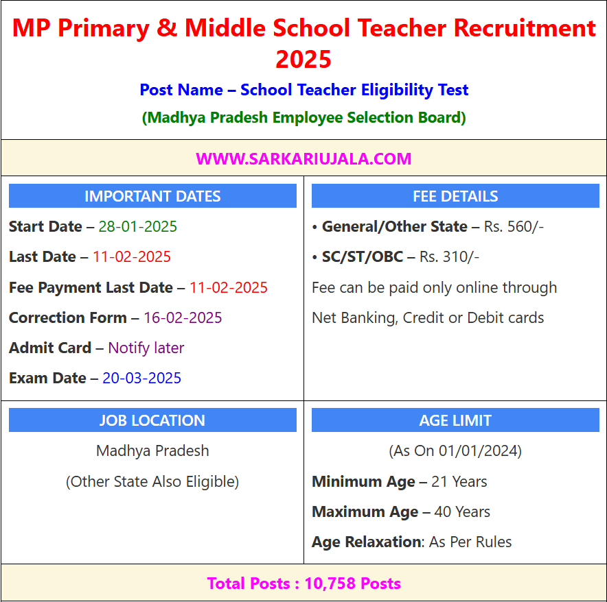 MP Primary & Middle School Teacher Recruitment 2025Post Name – School Teacher Eligibility Test(Madhya Pradesh Employee Selection Board) | |||||