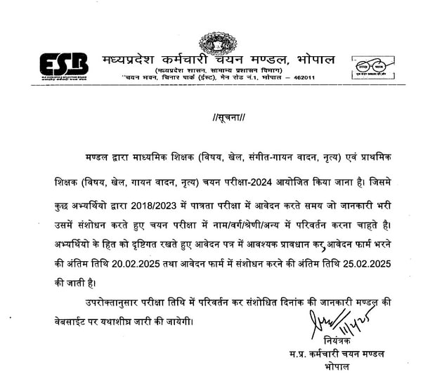 Post Description – Madhya Pradesh Professional Examination Board, MP PEB is inviting online applications for Primary & Middle School Teacher. Interested people meet all the eligibility criteria, apply online Details Of Recruitment Of MP Primary & Middle School Teacher Online Form 2025Posts Name – Primary & Middle School Teacher Middle School Teacher (Subject) – 7929 posts Middle School Teacher (Sports) – 338 posts Middle School Teacher (Music Gayan / Vadan) – 392 posts Primary School Teacher (Sports) – 1377 posts Primary School Teacher (Music Gayan / Vadan) – 452 posts Primary School Teacher (Music Nritya) – 270 posts Education Qualification – Middle School Teacher (Subject) – Passed MP Middle School Teacher Eligibility Test (2018 or 2023) AND Bachelor’s degree in a related subject with a 2-year Diploma in Elementary Education, OR Bachelor’s degree in a related subject with 50% marks and 1-year B.Ed, OR Bachelor’s degree in a related subject with 45% marks and B.Ed, OR 10+2 with 50% marks and a 4-year BLEd/BA BEd/BSc BEd, OR Bachelor’s degree in a related subject with 50% marks and 1-year B.Ed (Special). Middle School Teacher (Sports) – MP Middle School Teacher Eligibility Test 2023 Exam Passed And Bachelor Degree in Physical Education with 50% Marks (BPEd / BPE) Middle School Teacher (Music Gayan / Vadan) – MP Middle School Teacher Eligibility Test 2023 Exam Passed And 10+2 Intermediate with 50% Marks and Degree in Music. Primary School Teacher (Sports) – MP Middle School Teacher Eligibility Test 2023 Exam Passed And Bachelor Degree in Physical Education with 50% Marks (BPEd / BPE) Primary School Teacher (Music Gayan / Vadan) – MP Middle School Teacher Eligibility Test 2023 Exam Passed And 10+2 Intermediate with 50% Marks and Degree / Diploma in Music. Primary School Teacher (Music Nritya) – MP Middle School Teacher Eligibility Test 2023 Exam Passed And 10+2 Intermediate with 50% Marks and Degree / Diploma in Nritya. How to Apply Online MPESB Primary School MPTET Online Form 2025 – Candidates can apply through link provided below or they can also apply through official site of the Madhya Pradesh Professional Examination Board before 20/February/2025. Required Documents For Online Application – Educational Mark sheet And Certificates Aadhar Card / Pan Card Passport Size Photo Signature Selection Mode – Written Exam Final Merit List | |||||