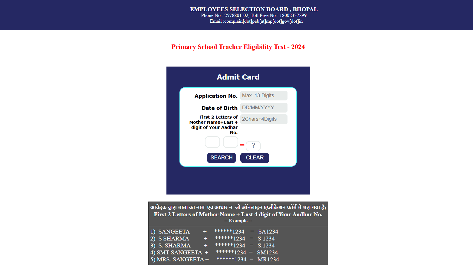 MPESB Primary School MPTET Admit Card 2024Post Name – School Teacher Eligibility Test(Madhya Pradesh Employee Selection Board) | |||||