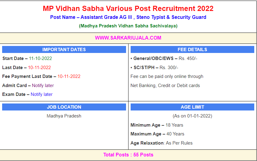 Post Description –Madhya Pradesh Vidhan Sabha Sachivalaya is inviting online applications for Various Posts for 55 posts. Interested people meet all the eligibility criteria, apply online Details Of Recruitment Of MP Vidhan Sabha Various Post Online Form 2022Posts Name – Assistant Grade AG III , Steno Typist & Security Guard Number Of Posts – 55 Posts Category Wise Posts – Assistant Grade AG 3 – 40 Posts Steno Typist – 02 Posts Security Guard – 13 Posts Pay Scale – Rs.19500 – 62000/- + Grade Pay Rs.1900/- Education Qualification – Assistant Grade AG 3 –10+2 Passed OR Bachelor Degree And 1 Year Computer Diploma / Certificate And CPCT Score Card And Hindi Computer Typing 300 Word in 10 Min. Steno Typist – 10+2 Passed / Bachelor Degree in Any Stream. And 1 Year Computer Diploma / Certificate. And CPCT Score Card And Hindi Stenographer : 80 w.p.m And 5 Minute in Computer at 80 w.p.m of 400 Words .(Dictation) English Typing Test 150 Words of 30 WPM. (Optional) Security Guard – 10+2 Passed / Bachelor Degree How to Apply Online MP Vidhan Sabha Various Post Online Form 2022 – Candidates can apply through link provided below or they can also apply through official site of the Madhya Pradesh Vidhan Sabha Sachivalaya before 10/Nov/2022. Required Documents For Online Application – Educational Mark sheet And Certificates Aadhar Card / Pan Card Passport Size Photo Signature Selection Mode – Written Examination Skill Test (If Applicable) PET/PST (If Applicable) Merit List