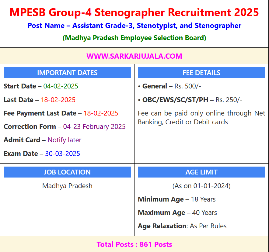 Post Description – The MPESB Group-4 Stenographer Recruitment 2025 is open for Assistant Grade-3, Stenotypist, and Stenographer posts. Candidates must have passed 10+2 from a recognized board, completed a 1-year computer course, and have typing or stenography skills. The application process starts on February 4, 2025, and ends on February 18, 2025. For more details, visit www.moneyujala.com. Details Of Recruitment Of MPESB Group-4 Stenographer Online Form 2025Posts Name – Assistant Grade-3, Stenotypist, and Stenographer Number Of Posts – 861 Posts Pay Scale – Rs. 19500 – 62000/- Education Qualification – 10+2 Inter Passed Exam in Any Recognized Board in India. And Minimum 1 Years Computer Course And Typing /Steno Skill. How to Apply Online MPESB Group-4 Stenographer Online Form 2025 – Candidates can apply through link provided below or they can also apply through official site of the Madhya Pradesh Employee Selection Board before 17/March/2025. Required Documents For Online Application – Educational Mark sheet And Certificates Aadhar Card / Pan Card Passport Size Photo Signature Selection Mode – Written Exam Skill Test Merit List