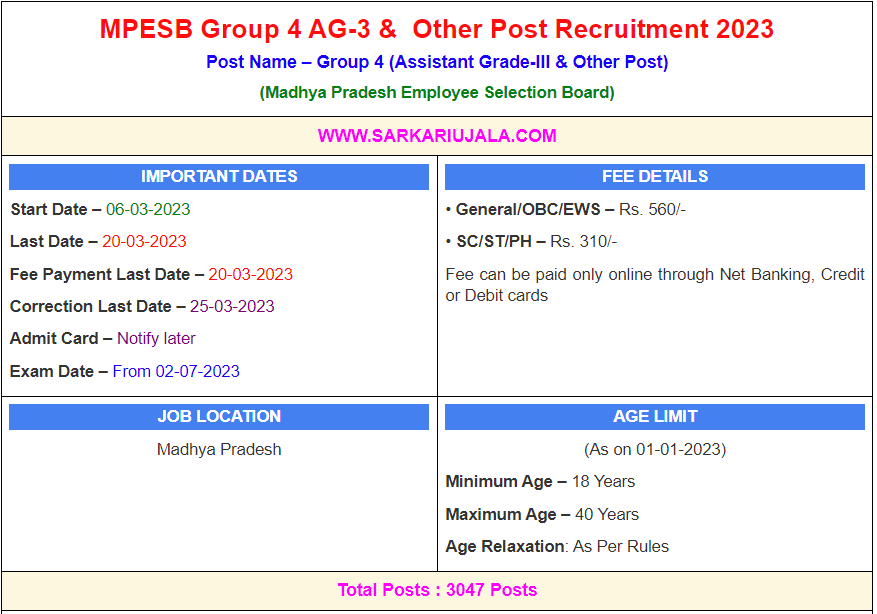 MPESB Group 4 AG-3 & Other Post Recruitment 2023Post Name – Group 4 (Assistant Grade-III & Other Post)(Madhya Pradesh Employee Selection Board) | |||||