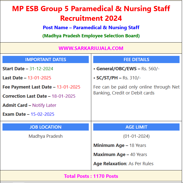 Post Description – The Madhya Pradesh Employee Selection Board (MP ESB) has announced the recruitment for Paramedical and Nursing Staff in 2024. The application process will start on December 31, 2024, and end on January 13, 2025, with the last date for fee payment being the same. Candidates can make corrections to their applications until January 18, 2025. The examination is scheduled for February 15, 2025. The application fee is Rs. 560 for General/OBC/EWS categories and Rs. 310 for SC/ST/PH candidates, payable online. The recruitment offers 1,170 posts for candidates aged between 18 and 40 years, with age relaxation as per rules. The job location will be in Madhya Pradesh. Details Of Recruitment Of MPESB Group 5 Various Post Online Form 2024Posts Name – Paramedical & Nursing Staff Number Of Posts – 1170 Posts Category Wise Posts – Nursing Officer, Staff Nurse, Male Nurse – 82 Posts Pharmacist Grade-2 – 29 Posts Laboratory Technician, Technologist, Technical Assistant, Lab Assistant, Lab Technologist – 634 Posts Radiographer, Dark Room Assistant, Radiographer/Radio Diagnosis Technologist, Ultrasound Technologist – 127 Posts OT Technician – 9 Posts Anesthetist – 11 Posts Dental Hygienist, Dental Mechanic, Dental Technologist – 14 Posts Prosthetics and Orthotics Technologist – 3 Posts Speech Therapist – 5 Posts Radiotherapy Technologist – 16 Posts CSSD Technician – 6 Posts Lab Attendant, Dissection Hall Attendant, OT Attendant, CSSD Attendant, Technician Assistant, Technician Helper – 197 Posts Dietician – 4 Posts ECG Technician, Physiotherapist, Respiratory Therapist – 8 Posts Cardiovascular Technician – 6 Posts Dialysis Technician – 6 Posts Primary Health Technician – 14 Posts Pay Scale – As Per Rules Education Qualification – 10+2 / Degree / Diploma / Certificate Note – For Post Wise Eligibility Details Must Read Official Notification How to Apply Online MPESB Group 5 Sub Engineer & Other Post Online Form 2024 – Candidates can apply through link provided below or they can also apply through official site of the Madhya Pradesh Employee Selection Board before 13/January/2025. Required Documents For Online Application – Educational Mark sheet And Certificates Aadhar Card / Pan Card Passport Size Photo Signature Selection Mode – Written Exam Skill Test Merit List