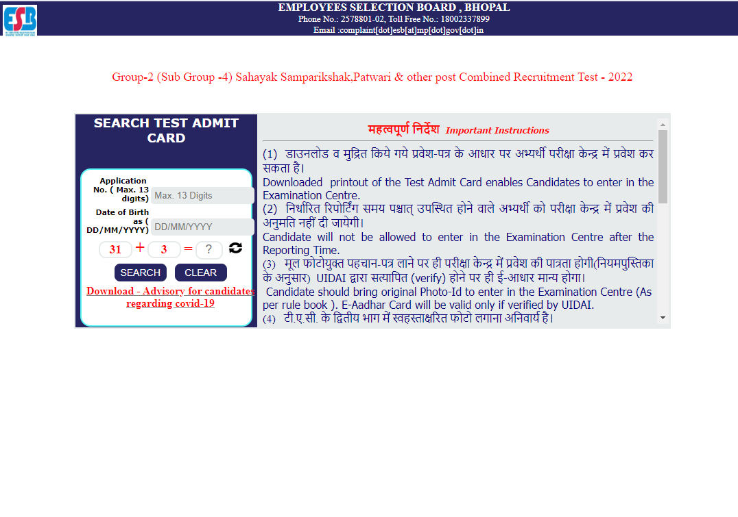 MPESB Patwari & Other Post Admit Card 2023Post Name – Patwari & Other Post(Madhya Pradesh Employee Selection Board) | |||||