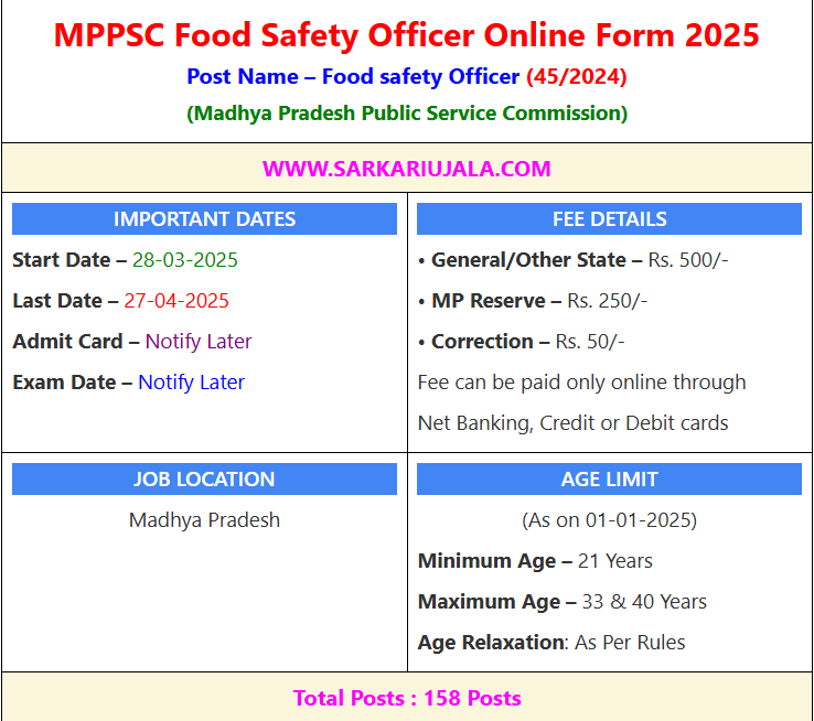 Post Description – MPPSC Madhya Pradesh Public Service Commission is inviting online applications for Food safety Officer for 158 posts. Interested people meet all the eligibility criteria, apply online Details Of Recruitment Of MPPSC Food Safety Officer Online Form 2025Posts Name – Food Safety Officer Number Of Posts – 120 Posts Category Wise Posts – General – 28 Posts EWS – 10 Posts OBC – 38 Posts SC – 16 Posts ST – 28 Posts Pay Scale – As Per Rules Education Qualification – Degree in Food Technology/ Dairy Technology & Related Field How to Apply Online MPPSC Food Safety Officer Online Form 2025 – Candidates can apply through link provided below or they can also apply through official site of the Madhya Pradesh Public Service Commission before 27/April/2025. Required Documents For Online Application – Educational Mark sheet And Certificates Aadhar Card / Pan Card Passport Size Photo Signature Selection Mode – Written Exam Interview Document Verification Final Merit List | |||||