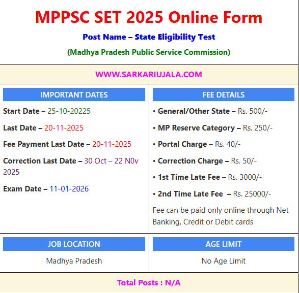 Post Description – MPPSC Madhya Pradesh Public Service Commission is inviting online applications for MPPSC State Eligibility Test SET. Interested people meet all the eligibility criteria, apply online Details Of Recruitment Of MPPSC State Eligibility Test SET Online Form 2025Posts Name – State Eligibility Test Number Of Posts – N/A Name Of Subject – Arabic, Chemical Sciences, Commerce, Computer Science, Criminology, Defence and stategic studies, Economics, Electronic Science, English, Environmental, Erath, Atmospheric, Ocean and Planetary Sciences, Science, Geography, Hindi, History, Home science, Law, Library and Information Science, Life Sciences, Marathi, Mathematical Sciences, Music, Performing Arts (Dance, Drama, Theatre), Persian, Philosophy, Physical Sciences, Physical Education, Political science, Psychology, Public Administration, Sanskrit, Sanskrit Traditional Subjects, Social Work, Sociology, Urdu, Visual Arts, Yoga Education Qualification – Passed / Appearing Post Graduation Degree in Related Subject with 55% Marks in Any Recognized University in India. How to Apply Online MPPSC State Eligibility Test SET Online Form 2025 – Candidates can apply through link provided below or they can also apply through official site of the State Eligibility Test before 20/November/2025. Required Documents For Online Application – Educational Mark sheet And Certificates Aadhar Card / Pan Card Passport Size Photo Signature Selection Mode – Written Exam Merit List