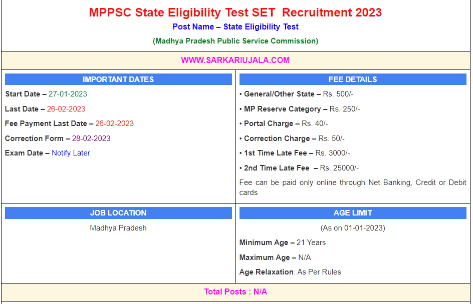 MPPSC State Eligibility Test SET Recruitment 2023Post Name – State Eligibility Test(Madhya Pradesh Public Service Commission) | |||||