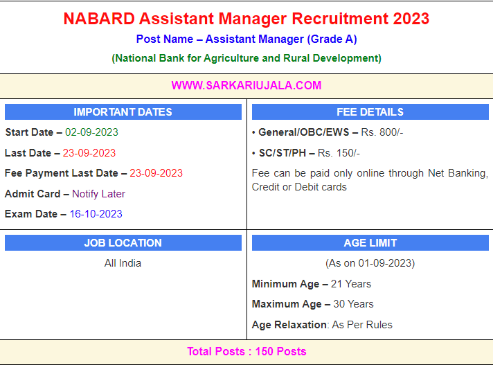 Post Description – NABARD National Bank for Agriculture and Rural Development is inviting online applications for Assistant Manager “Grade A” for 150 posts. Interested people meet all the eligibility criteria, apply online Details Of Recruitment Of NABARD Assistant Manager Online Form 2023Posts Name – Assistant Manager “Grade A” Number Of Posts – 150 Posts Category Wise Posts – General – 77 Post Computer/ Information Technology –40 Posts Finance –15 Posts Company Secretary –3 Posts Civil Engineering –3 Posts Electrical Engineering -3 Posts Geo Informatics -2 Posts Forestry –2 Posts Food Processing -2 Posts Statistics -2 Posts Mass Communication/Media Specialist -1 Posts Pay Scale – As per Rules Education Qualification – Bachelor Degree with 60% Marks ( 55% Marks For SC/ST/PH ) OR Master Degree with 55% Marks (50% for SC/ ST/ PWD) OR CA/ CS/ ICWA/ Ph.D Note- Must Read Official Notification For Details Qualification. How to Apply Online NABARD Assistant Manager Online Form 2023 – Candidates can apply through link provided below or they can also apply through official site of the NABARD before 23/September/2023. Required Documents For Online Application – Educational Mark sheet And Certificates Aadhar Card / Pan Card Passport Size Photo Signature Selection Mode – Phase I Exam Phase II Exam Interview Merit List