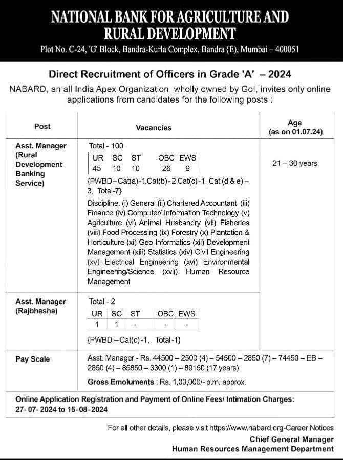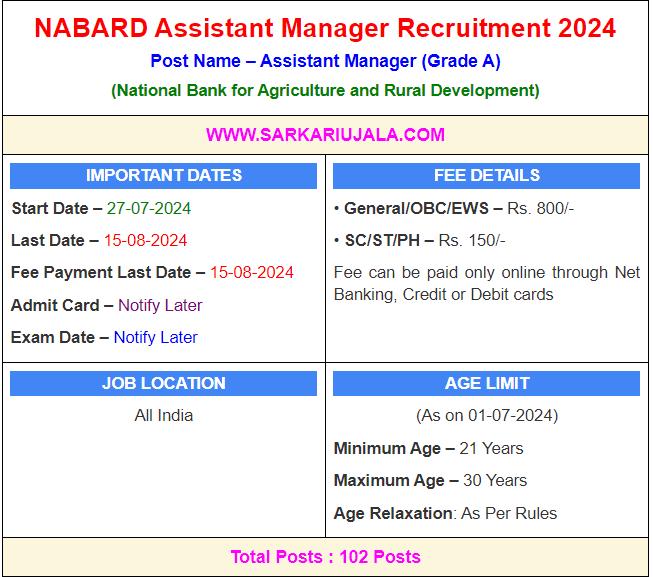 Post Description – NABARD National Bank for Agriculture and Rural Development is inviting online applications for Assistant Manager “Grade A” for 102 posts. Interested people meet all the eligibility criteria, apply online Details Of Recruitment Of NABARD Assistant Manager Online Form 2024Posts Name – Assistant Manager “Grade A” Number Of Posts – 102 Posts Category Wise Posts – Assistant Manager (RDBS) – 100 Post Assistant Manager (Rajbhasha) –02 Posts Pay Scale – Rs. 44,500- 89,150/- Education Qualification – Bachelor Degree with 60% Marks ( 55% Marks For SC/ST/PH ) OR Master Degree with 55% Marks (50% for SC/ ST/ PWD) OR CA/ CS/ ICWA/ Ph.D Note- Must Read Official Notification For Details Qualification. How to Apply Online NABARD Assistant Manager Online Form 2024 – Candidates can apply through link provided below or they can also apply through official site of the NABARD before 15/August/2024. Required Documents For Online Application – Educational Mark sheet And Certificates Aadhar Card / Pan Card Passport Size Photo Signature Selection Mode – Phase I Exam Phase II Exam Interview Merit List
