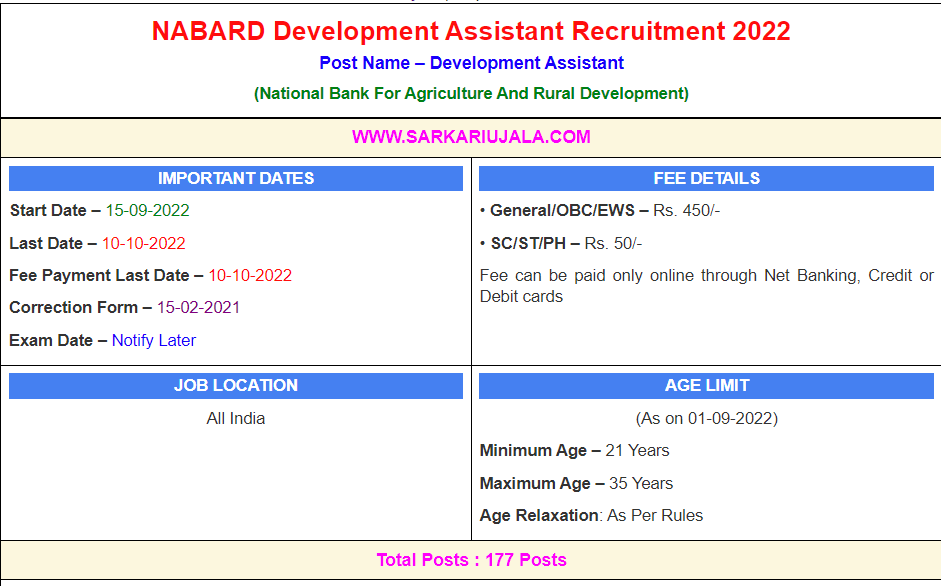 Post Description – NABARD is inviting online applications for Development Assistant for 177 posts. Interested people meet all the eligibility criteria, apply online Details Of Recruitment Of NABARD Development Assistant Online Form 2022Posts Name – Development Assistant Number Of Posts – 177 Posts Category Wise Posts – Development Assistant – 173 Posts General – 80 Posts OBC – 46 Posts SC – 21 Posts ST – 11 Posts EWS – 15 Posts Development Assistant (Hindi) – 04 Posts General – 03 Posts ST – 01 Posts Pay Scale – Rs.13150 – 34990/- Education Qualification – Development Assistant – Bachelor Degree With 50% Marks (For SC/ST Only Passed ) Development Assistant (Hindi)- Bachelor Degree With Hindi & English As Compulsory/Main Subject With 50% Marks (For SC/ST Only Passed ) How to Apply Online NABARD Development Assistant Online Form 2022 – Candidates can apply through link provided below or they can also apply through official site of the NABARD before 10/October/2022. Required Documents For Online Application – Educational Mark sheet And Certificates Aadhar Card / Pan Card Passport Size Photo Signature Selection Mode – Written Examination Final Merit List