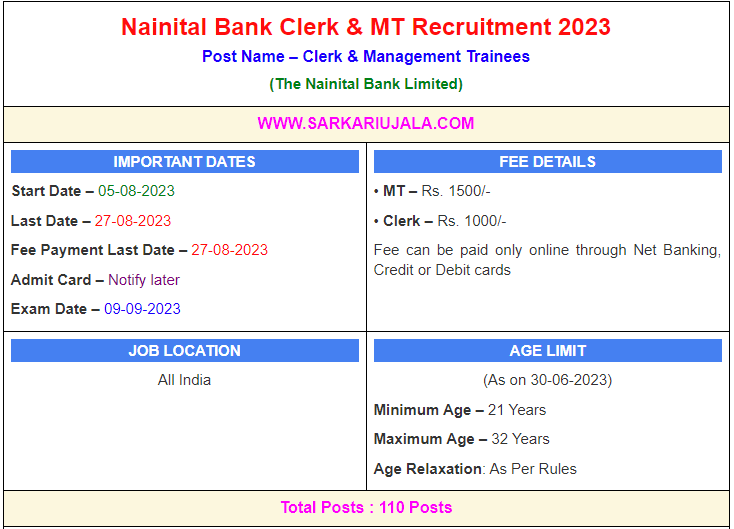 Nainital Bank Clerk & MT Recruitment 2023Post Name – Clerk & Management Trainees(The Nainital Bank Limited) | |||||