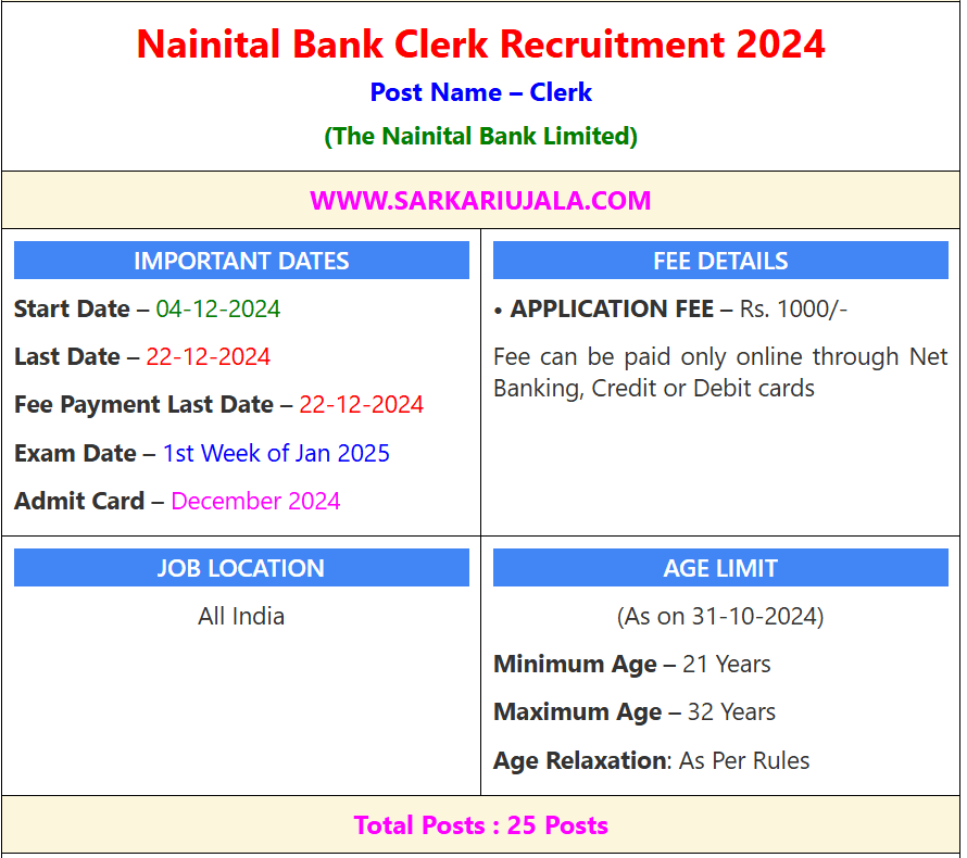 Post Description – Nainital Bank Limited has announced the recruitment for Clerk positions in 2024. The application process starts on December 4, 2024, and ends on December 22, 2024, with the last date for fee payment being the same. The exam is scheduled for the first week of January 2025, and admit cards will be available in December 2024. The application fee is Rs. 1000, payable online through Net Banking, Credit or Debit cards. The job location is across India. The age limit for applicants is between 21 and 32 years as of October 31, 2024, with age relaxation as per rules. There are a total of 25 posts available for this recruitment. For more details, visit SarkariUjala.Com Details Of Recruitment Of Nainital Bank Clerk Online Form 2024Posts Name – Clerk Number Of Posts – 25 Posts Pay Scale – As per Rules Education Qualification – Graduation/ Post Graduation with minimum 50% of marks & Proficiency in Computer skills and knowledge of Hindi & English languages will be preferred. How to Apply Online Nainital Bank Clerk Online Form 2024 – Candidates can apply through link provided below or they can also apply through official site of the The Nainital Bank Limited before 22/December/2024. Required Documents For Online Application – Educational Mark sheet And Certificates Aadhar Card / Pan Card Passport Size Photo Signature Selection Mode – CBT Exam Merit List