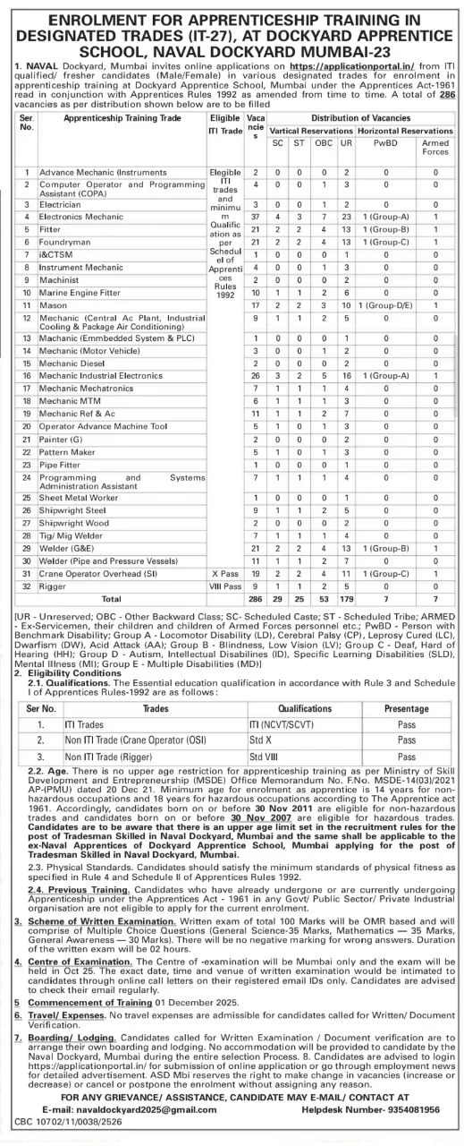 Post Description – Naval Dockyard, Mumbai is inviting online applications for Apprentice for 286 posts. Interested people meet all the eligibility criteria, apply online Details Of Recruitment Of Naval Dockyard Apprentice Online Form 2025Posts Name – Apprentice Number Of Posts – 286 Posts Category Wise Posts – Advanced Mechanic Instruments- 02 Posts Computer Operator And Programming Assistant (COPA)- 04 Posts Electrician – 3 Posts Electronics Mechanics – 37 Posts Fitter – 21 Posts Foundryman – 21 Posts I&CTSM- 1 Posts Instrument Mechanic- 4 Posts Machinist – 2 Posts Marine Engine Fitter – 10 Posts Mason- 17 Posts Mechanic (Central Ac Plant , Industrial Cooling & Package Air Conditioning )- 9 Posts Mechanic (Embedded System & PLC )- 1 Posts Mechanic (Motor Vehicle)- 3 Posts Mechanic Diesel –2 Posts Mechanic Industrial Electronics –26 Posts Mechanic Mechatronics –7 Posts Mechanic MTM –6 Posts Mechanic Ref & Ac –11 Posts Operator Advance Machine tool-5 Posts Painter (G)-2 Posts Pattern Maker –5 Posts Pipe Fitter-1 Posts Programming Administration Assistant –7 Posts Sheet Metal Worker –1 Posts Shipwright Steel –9 Posts Shipwright Wood –2 Posts Tig/ Mig Welder –7 Posts Welder (G&E)-21 Posts Welder (Pipe And Pressure Vessels)-11 Posts Crane Operator Overhead (SI) –19 Posts Rigger –9 Posts Stipend– As Per Rules Education Qualification – For ITI Trades – 10th Exam Passed with ITI NCVT / SCVT Certificate For Non-ITI Trades – Rigger – Class 8 Passed From Any Board. Crane Operator Overhead – 10th Passed From any Board. How to Apply Online Naval Dockyard Apprentice Online Form 2025 – Candidates can apply through link provided below or they can also apply through official site of the Naval Dockyard, Mumbai before 22/September/2025. Required Documents For Online Application – Educational Mark sheet And Certificates Aadhar Card / Pan Card Passport Size Photo Signature Selection Mode – Shortlist Written Exam Interview Doc Verification