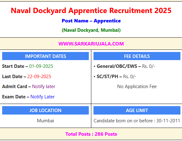 Naval Dockyard Apprentice Recruitment 2025Post Name – Apprentice(Naval Dockyard, Mumbai) | |||||