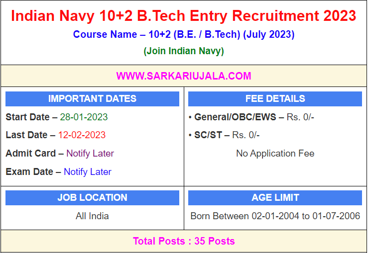Post Description – Join Indian Navy is inviting online applications for 10+2 B.E. / B.Tech (July 2023 Batch) for 35 posts. Interested people meet all the eligibility criteria, apply online Details Of Recruitment Of Indian Navy 10+2 B.Tech Entry (July 2023) Online Form 2023Posts Name – B.E. / B.Tech (July 2023) Number Of Posts – 35 Posts Category Wise Posts – Education Branch – 05 Posts Executive & Technical Post – 30 Posts Education Qualification – 10+2 Passed from any Board with 70% marks in Physics, Chemistry, Math in Each Subject. And 50% Marks in English And Candidates Must be Enrolled and Appeared in JEEMAIN 2022 Entrance Examination. How to Apply Online Indian Navy 10+2 B.Tech Entry Online Form 2023 – Candidates can apply through link provided below or they can also apply through official site of the Join Indian Navy before 12/Feb/2023. Required Documents For Online Application – 10th / 12th Mark sheet And Certificates Aadhar Card / Pan Card Passport Size Photo Signature Selection Mode – Short List SSB Interview Final Merit List