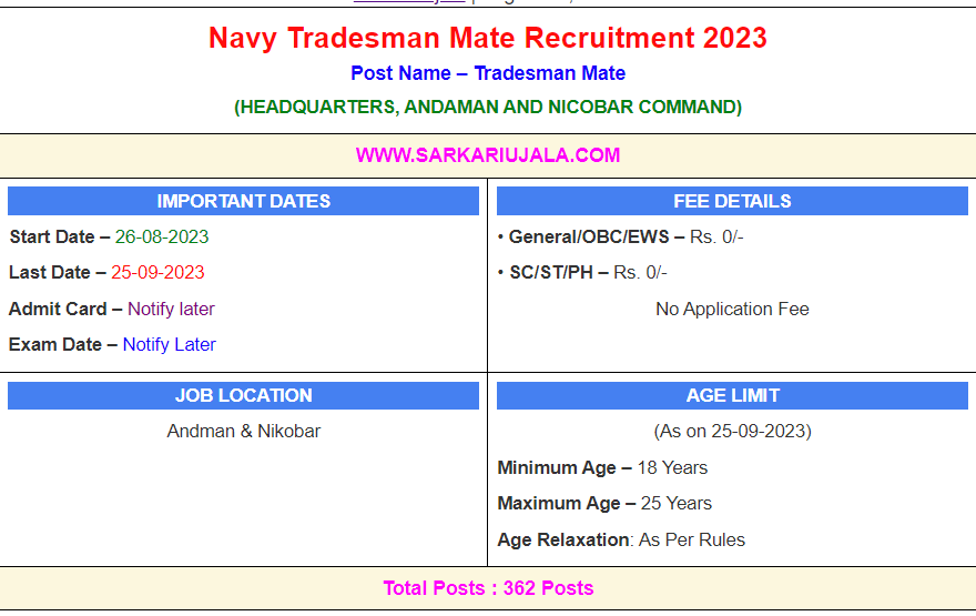 Post Description – Headquarters Of Andaman and Nicobar Command is inviting online applications for Tradesman Mate for 362 posts. Interested people meet all the eligibility criteria, apply online Details Of Recruitment Of Navy Tradesman Mate Online Form 2023Posts Name – Tradesman mate Number Of Posts – 362 Posts Category Wise Posts – General – 139 Posts OBC – 91 Posts SC – 50 Posts ST – 25 Posts EWS – 33 Posts Tradesman Mate (for NAD, Dollygunj)- 24 posts Pay Scale – Rs.18000 – 56900/- (Level – 1) Education Qualification – 10th Passed & ITI Certificate In Relevant Trade How to Apply Online Navy Tradesman Mate Online Form 2023 – Candidates can apply through link provided below or they can also apply through official site of the Headquarters Of Andaman and Nicobar Command before 25/September/2023. Required Documents For Online Application – Educational Mark sheet And Certificates Aadhar Card / Pan Card Passport Size Photo Signature Selection Mode – Screening of Application Written Exam Trade Test Document Verification Medical Exam