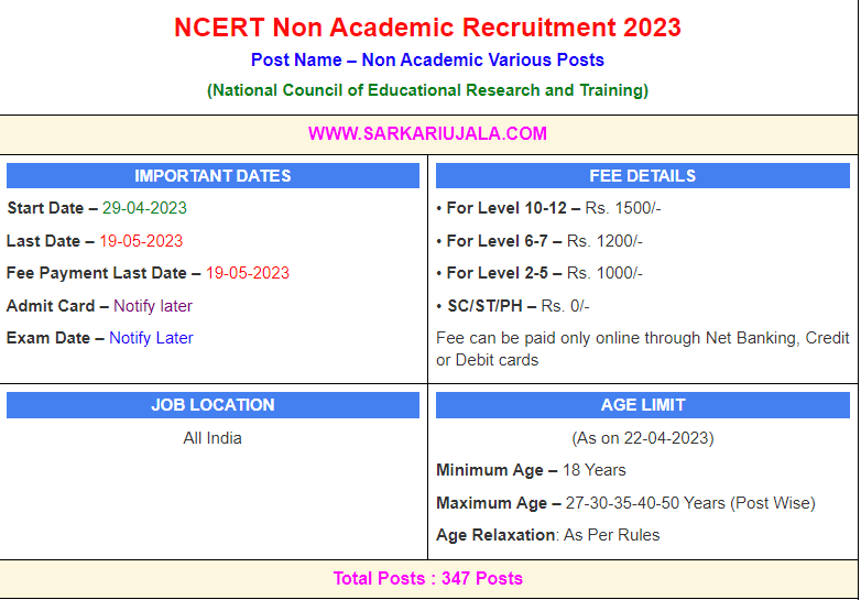 Post DescriptionNCERT National Council of Educational Research and Training is inviting online applications for Non Academic Various Posts for 347 posts. Interested people meet all the eligibility criteria, apply online