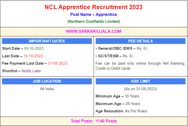 NCL Apprentice Recruitment 2023Post Name – Apprentice(Northern Coalfields Limited) | |||||