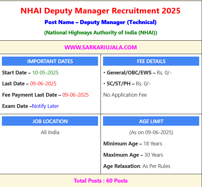 Post Description – National Highways Authority of India is inviting online applications for Deputy Manager for 60 posts. Interested people meet all the eligibility criteria, apply online Details Of Recruitment Of NHAI Deputy Manager Online Form 2025Posts Name – Deputy Manager (Technical) Number Of Posts – 60 Posts Category Wise Posts – General – 27 Posts OBC – 13 Posts SC – 09 Posts ST – 04 Posts EWS – 07 Posts Pay Scale – As Per Rules Education Qualification – Bachelor’s Degree in Civil Engineering And Graduate Aptitude Testin Engineering (GATE) Score 2025 in Civil Engineering discipline. How to Apply Online NHAI Deputy Manager Online Form 2025 – Candidates can apply through link provided below or they can also apply through official site of the National Highways Authority of India before 09/June/2025. Required Documents For Online Application – Educational Mark sheet And Certificates Aadhar Card / Pan Card Passport Size Photo Signature Selection Mode – Merit List