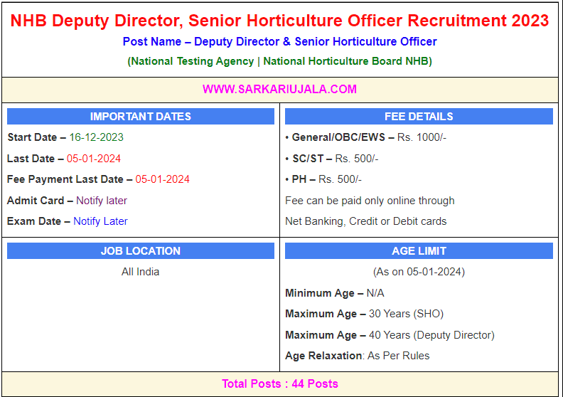 Post Description – NHB National Horticulture Board NHB is inviting online applications for Deputy Director And Senior Horticulture Officer for 44 posts. Interested people meet all the eligibility criteria, apply online Details Of Recruitment Of NHB Deputy Director, Senior Horticulture Officer Online Form 2023Posts Name – Deputy Director And Senior Horticulture Officer Number Of Posts – 44 Posts Category Wise Posts – Deputy Director – 1200 Posts Senior Horticulture Officer SHO– 1200 Posts Pay Scale – As Per Rules Education Qualification – Deputy Director- Bachelor Degree in Horticulture/ Agriculture/ Post-harvest Technology/ Agriculture Economics/ Agriculture Engineering/Post-harvest Management/Food Technology/Food Science. And 5 Year Experience. Senior Horticulture Officer SHO- Bachelor Degree in Horticulture/ Agriculture/ Post-harvest Technology/ Agriculture Economics/ Agriculture Engineering/Post-harvest Management/Food Technology/Food Science. How to Apply Online NHB Deputy Director, Senior Horticulture Officer Online Form 2023 – Candidates can apply through link provided below or they can also apply through official site of the National Horticulture Board before 05/January/2023. Required Documents For Online Application – Educational Mark sheet And Certificates Aadhar Card / Pan Card Passport Size Photo Signature Selection Mode – CBT Exam | |||||