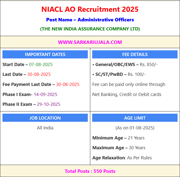 Post Description – NIACL The New India Assurance Company Ltd is inviting online applications for Administrative Officers for 550 posts. Interested people meet all the eligibility criteria, apply online Details Of Recruitment Of NIACL AO Online Form 2025Posts Name – Administrative Officers Number Of Posts – 550 Posts Category Wise Posts – Risk Engineers– 50 Posts Automobile Engineers – 75 Posts Legal Specialists- 50 Posts Accounts Specialists – 25 Posts AO (Health)- 50 Posts IT Specialists – 25 Posts Business Analysts- 75 Posts Company Secretary- 02 Posts Actuarial Specialists- 05 Posts Generalists- 193 Posts Pay Scale – As Per Rules Education Qualification – Risk Engineers– Engineering (Graduation/ Post-graduation) in any discipline with min 60% (55% for SC/ST/PwBD) Automobile Engineers – B.E./B.Tech./M.E./M.Tech in Automobile Engineering with min 60% (55% for SC/ST/PwBD) Or Graduate in any branch of Engineering with min 60% (55% for SC/ST/PwBD) together with Diploma (at least one year duration) in Automobile Engineering. Legal Specialists– Graduate/Post-graduate in Law with min 60% (55% for SC/ST/PwBD) Accounts Specialists – Chartered Accountant (ICAI)/ Cost and Management Accountant (The Institute of Cost Accountants of India, earlier known as ICWAI) and Graduation/Post-graduation in any discipline with min 60% (55% for SC/ST/PwBD) Or MBA Finance/PGDM Finance/ M.Com with min 60% (55% for SC/ST/PwBD) AO (Health)– MBBS/MD/MS or PG Medical Degree OR BDS/MDS OR BAMS/BHMS (Graduate/PG) from a recognized university with minimum 60% marks (55% for SC/ST/PwBD). OR equivalent foreign degree recognized by MCI/DCI/NCISM/NCH (as applicable) And Candidate must have valid registration with MCI / DCI /State Medical /Dental Council And NCISM/NCH (as per the stream) IT Specialists – B.E./B.Tech/M.E/M.Tech in IT or Computer Science Discipline OR M.C.A with min 60% (55% for SC/ST/PwBD) Business Analysts– Bachelors/Masters degree in Statistics/Mathematics/Actuarial Science/Data Science/Business Analysts from a recognized University with min 60% marks in either of the degree examination (min 55% for SC/ST/PwBD candidates) Company Secretary– ACS/FCS from ICSI And Graduation/Post-graduation in any discipline with min 60% (at least 55% for SC/ST/PwBD candidates) Actuarial Specialists– Graduation/Post-graduation in any discipline with min 60% (at least 55% for SC/ST/PwBD candidates) And Cleared minimum four Actuarial papers from IAI or IFoA necessarily including CM1 and not including CB3 and be an active member of IFoA or IAI Generalists– Graduate/Post Graduate in any discipline from a recognised University or any equivalent qualification recognised as such by Central Government with at least 60% marks in either of the degree examination (at least 55% marks for SC/ST/PwBD candidates). How to Apply Online NIACL AO Online Form 2025 – Candidates can apply through link provided below or they can also apply through official site of the National Insurance Company Limited before 30/August/2025. Required Documents For Online Application – Educational Mark sheet And Certificates Aadhar Card / Pan Card Passport Size Photo Signature Selection Mode – CBT Exam Main Exam Interview Merit List | |||||