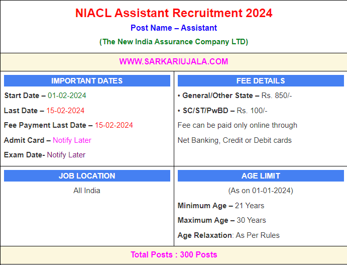 Post Description – The New India Assurance Company LTD is inviting online applications for Assistant for 300 posts. Interested people meet all the eligibility criteria, apply online Details Of Recruitment Of NIACL Assistant Online Form 2024Posts Name – Assistant Number Of Posts – 300 Posts General – 30 Posts OBC- 10 Posts EWS- 30 Posts SC – 68 Posts ST- 43 Posts Pay Scale – Rs. 22,405/- To Rs. 62,265/- Education Qualification – Graduation From any discipline with Knowledge Of Regional Language. How to Apply Online NIACL Assistant Online Form 2024 – Candidates can apply through link provided below or they can also apply through official site of the The New India Assurance Company LTD before 15/February/2024. Required Documents For Online Application – Educational Mark sheet And Certificates Aadhar Card / Pan Card Passport Size Photo Signature Selection Mode – Written Exam Medical Merit List