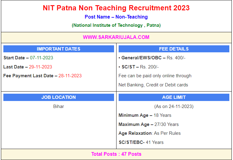Post Description – NIT National Institute of Technology , Patna is inviting online applications for Various Posts for 47 posts. Interested people meet all the eligibility criteria, apply online Details Of Recruitment Of NIT Patna Non Teaching Online Form 2023Posts Name – Non Teaching Posts Number Of Posts – 47 Posts Category Wise Posts – Superintendent – 05 Posts Technical Assistant – 11 Posts Technician – 18 Posts Junior Assistant(Accounts) – 06 Posts Office Attendant – 07 Posts Pay Scale – Rs.19500 – 62000/- + Grade Pay Rs.1900/- Education Qualification – Superintendent – Bachelor’s degree in any discipline or Master Degree in any discipline with at least 50% marks. Technical Assistant – B.Tech/Diploma in Related Field. Technician – 12th with Science/ ITI/ Diploma In Relevant Trade. Junior Assistant(Accounts) – 10+2 Passed And minimum Typing Speed of 35 w.p.m. and proficiency in Computer Word Processing and Spread Sheet. Office Attendant – 10+2 Passed How to Apply Online NIT Patna Non Teaching Online Form 2023 – Candidates can apply through link provided below or they can also apply through official site of the National Institute of Technology , Patna before 29/November/2023. Required Documents For Online Application – Educational Mark sheet And Certificates Aadhar Card / Pan Card Passport Size Photo Signature Selection Mode – Shortlist Written Exam Skill Test Merit List | |||||