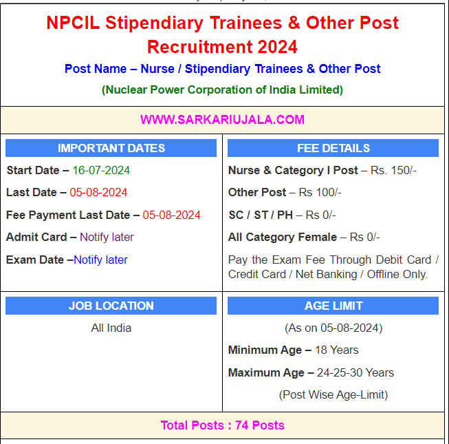 Post Description –Nuclear Power Corporation of India Limited is inviting online applications for Various Posts for 74 posts. Interested people meet all the eligibility criteria, apply online Details Of Recruitment Of NPCIL Various Post Online Form 2024Posts Name –Paramedical Posts, Stipendiary Trainees (Cat I & II), Non-Technical Posts Number Of Posts – 74 Posts Category Wise Posts – Nurse – A – 01 Posts Stipendiary Trainees ST/TN Operator Category II – 60 Posts Stipendiary Trainees / Scientific Assistant ST / SA Cat-1 – 21 Posts X Rah Technician C – 01 Posts Pay Scale – As Per Rules Education Qualification – Nurse – A – 10+2 with Nursing Diploma 3 Year Course OR B.SC Nursing Registration in State Nursing Council. Stipendiary Trainees ST/TN Operator Category II – Stipendiary Trainees / Scientific Assistant ST / SA Cat-1 (Diploma Holders in Engineering) – Diploma in Engineering with 60% Marks in Related Trade. Stipendiary Trainees / Scientific Assistant ST / SA Cat-1 (Science Graduates) – Bachelor Degree in Science B.SC with Physics as Principal Subject with 60% Marks in Related Subjects. Stipendiary Trainees ST/TN Operator Category II – 10th with Science Subject Minimum 50% Marks and Mathematics Individually and 2 Year ITI Certificate Course in Stipendiary Trainees ST/TN Operator Category II (Operator) – 10+2 with Science Stream PCM Group Subject with Minimum 50% Marks. And English as One the Subject in 10th Level Exam. X Ray Technician C – 10+2 with Science Stream Minimum 60% Marks with 1 Year Radiography / X Ray Trade Certificate. And 2 Year Experience. How to Apply Online NPCIL Various Post Online Form 2024 – Candidates can apply through link provided below or they can also apply through official site of the Nuclear Power Corporation of India Limited before 05/August/2024. Required Documents For Online Application – Educational Mark sheet And Certificates Aadhar Card / Pan Card Passport Size Photo Signature Selection Mode – Written Exam Skill Test Final Merit List
