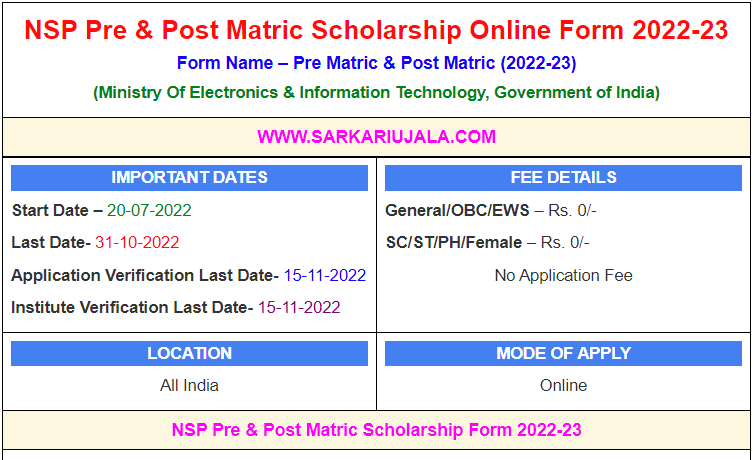 NSP Pre & Post Matric Scholarship Online Form 2022-23Form Name – Pre Matric & Post Matric (2022-23)(Ministry Of Electronics & Information Technology, Government of India) | |||||