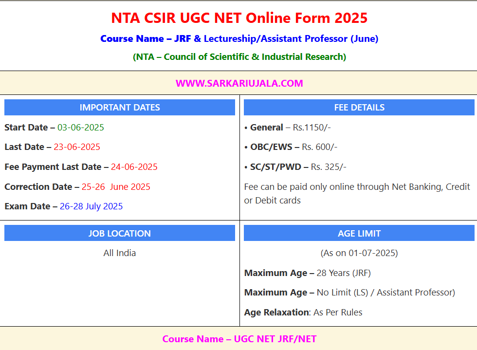 Post Description – NTA Council of Scientific & Industrial Research CSIR is inviting online applications for UGC NET JRF/NET. Interested people meet all the eligibility criteria, apply online Details Of Recruitment Of NTA CSIR UGC NET June Online Form 2025Course Name – UGC NET JRF/NET Education Qualification – M.Sc / Equivalent Degree with 55% Marks (For SC / ST and PH Candidates 50% Marks) Note- : Integrated Course and B.E/ B.Tech / B.Pharma and MBBS Candidates Are Also Eligible. How to Apply Online NTA CSIR UGC NET June Online Form 2025 – Candidates can apply through link provided below or they can also apply through official site of the National Testing Agency NTA before 23/June/2025. Required Documents For Online Application – Educational Mark sheet And Certificates Aadhar Card / Pan Card Passport Size Photo Signature Selection Mode – Written Exam Merit List