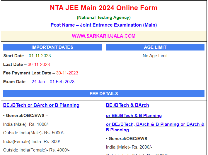 Post Description – NTA National Testing Agency is inviting online applications for JEE Main 2024 for Entrance Examination & Admission. Interested people meet all the eligibility criteria, apply online Details Of Recruitment Of NTA JEE Main 2024 Online Form Course Name – BE./BTech ,BArch, Planning Education Qualification – B.E/ B. Tech/B. Arch. –10+2 Passed With PCM (Physics ,Chemistry & Math) For B. Planning- 10+2 Passed with Mathematics. How to Apply Online NTA JEE Main 2024 Online Form – Candidates can apply through link provided below or they can also apply through official site of the National Testing Agency before 30/November/2023. Required Documents For Online Application – 12th Mark sheet And Certificates Aadhar Card / Pan Card Passport Size Photo Signature Selection Mode – CBT Exam Final Result | |||||