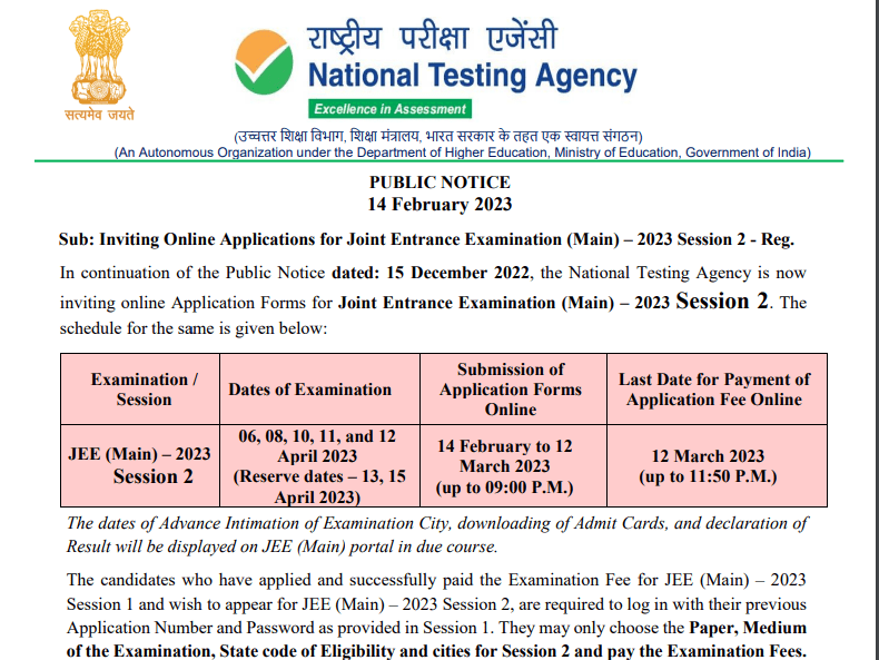 NTA JEE Main 2023 Online Form(National Testing Agency) Post Name – Joint Entrance Examination (Main) | |||||