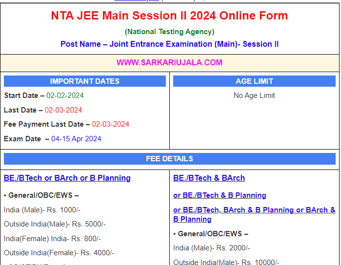 NTA JEE Main Session II 2024 Online Form(National Testing Agency) Post Name – Joint Entrance Examination (Main)- Session II | |||||