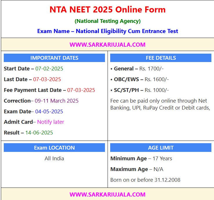 NTA NEET 2025 Online Form(National Testing Agency) Exam Name – National Eligibility Cum Entrance Test | |||||
