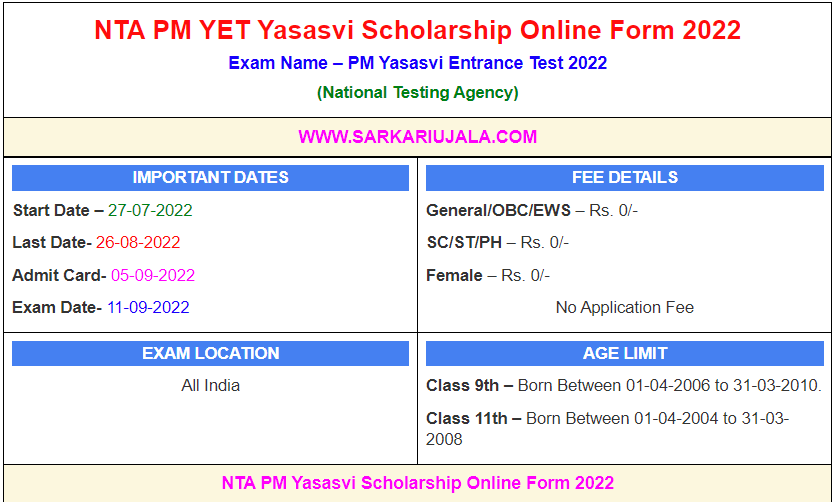 NTA PM YET Yasasvi Scholarship Online Form 2022Exam Name – PM Yasasvi Entrance Test 2022(National Testing Agency) | |||||