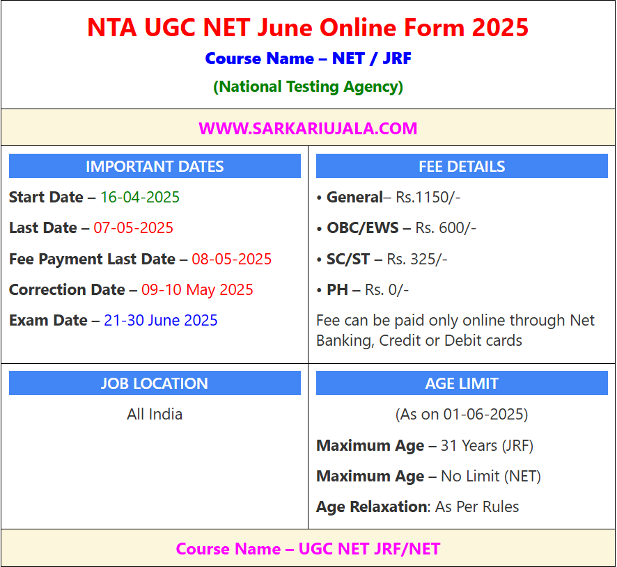 NTA UGC NET June Online Form 2025Course Name – NET / JRF(National Testing Agency) | |||||