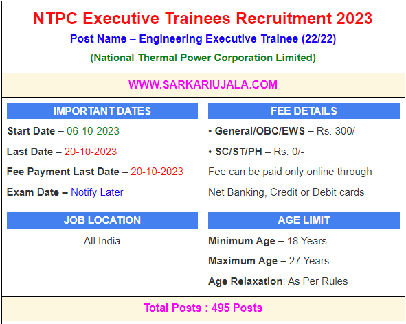Post Description – NTPC National Thermal Power Corporation Limited is inviting online applications for Engineering Executive Trainee for 495 posts. Interested people meet all the eligibility criteria, apply online Details Of Recruitment Of NTPC Executive Trainees Online Form 2023Posts Name – Engineering Executive Trainee Number Of Posts – 495 Posts Category Wise Posts – Electrical– 120 Posts Mechanical – 200 Posts Electronics & Instrumentation – 80 Posts Civil – 30 Posts Mining – 65 Posts Pay Scale – Rs. 40,000 – 1,40,000/- (E1 Grade) Education Qualification – B.Tech / B.E. in Related Field With 65% marks (55% Marks For SC/ST/PH) & Appeared GATE 2023 Exam. How to Apply Online NTPC Executive Trainees Online Form 2023 – Candidates can apply through link provided below or they can also apply through official site of the NTPC National Thermal Power Corporation Limited before 20/Oct/2023. Required Documents For Online Application – Educational Mark sheet And Certificates Aadhar Card / Pan Card Passport Size Photo Signature Selection Mode – Written Examination Merit List
