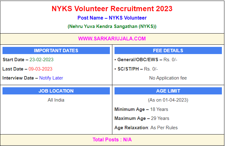 NYKS Volunteer Recruitment 2023Post Name – NYKS Volunteer(Nehru Yuva Kendra Sangathan (NYKS)) | |||||