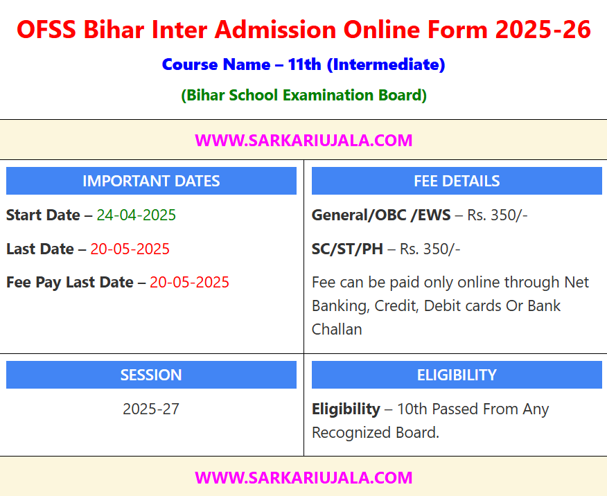 OFSS Bihar Inter Admission Online Form 2025-26Course Name – 11th (Intermediate)(Bihar School Examination Board) | |||||