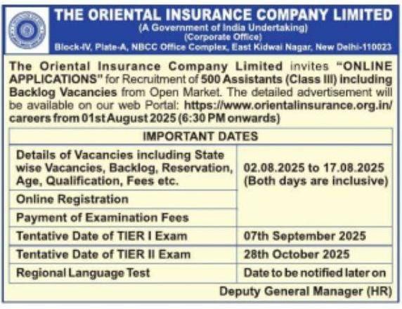 Oriental Insurance OICL Assistant Recruitment 2025Post Name – Assistant (Level III)(The Oriental Insurance Company Ltd ) | |||||