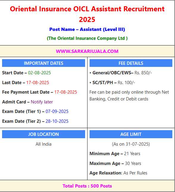 Post Description – IOCL The Oriental Insurance Company Ltd is inviting online applications for Assistant for 500 posts. Interested people meet all the eligibility criteria, apply online Details Of Recruitment Of Oriental Insurance OICL Assistant Online Form 2025Posts Name – Assistant (Level III) Number Of Posts – 500 Posts Category Wise Posts – General – 113 Posts OBC – 173 Posts SC – 122 Posts ST – 77 Posts EWS – 15 Posts Pay Scale – As Per Rules Education Qualification – Graduation Degree From Any Board. How to Apply Online Oriental Insurance OICL AO Online Form 2025 – Candidates can apply through link provided below or they can also apply through official site of the The Oriental Insurance Company Ltd before 17/August/2025. Required Documents For Online Application – Educational Mark sheet And Certificates Aadhar Card / Pan Card Passport Size Photo Signature Selection Mode – Written Exam Medical Final Merit List | |||||