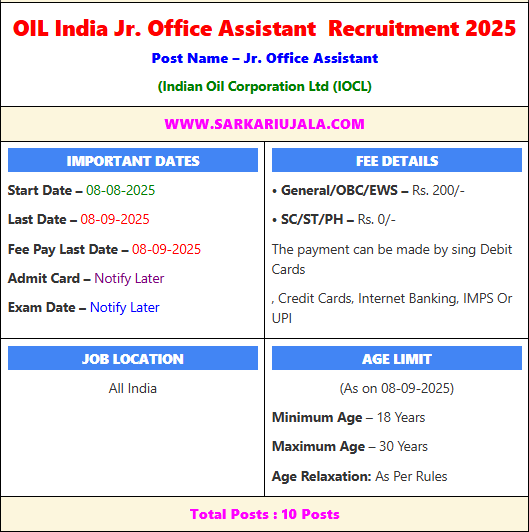 OIL India Jr. Office Assistant Recruitment 2025Post Name – Jr. Office Assistant(Indian Oil Corporation Ltd (IOCL) | |||||