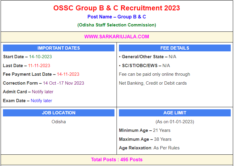 Post Description – OSSC Odisha Staff Selection Commission is inviting online applications for Group B & C for 495 posts. Interested people meet all the eligibility criteria, apply online Details Of Recruitment Of OSSC Group B & C Online Form 2023Posts Name – Group B & C Number Of Posts – 495 Posts Pay Scale – As Per Rules Education Qualification – Graduation Degree And 8th/10th/12th With Odia Language. How to Apply Online OSSC CGL Group B & C Online Form 2023 – Candidates can apply through link provided below or they can also apply through official site of the Odisha Staff Selection Commission before 11/November/2023. Required Documents For Online Application – Equational Mark sheet And Certificates Aadhar Card / Pan Card Passport Size Photo Signature Selection Mode – Written Exam PET/PST Medical Final Merit List
