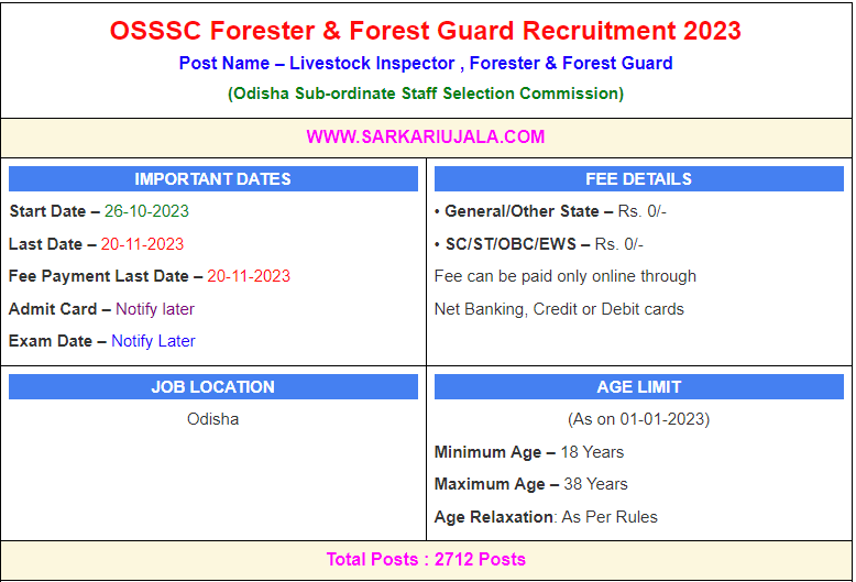 Post Description – OSSSC Odisha Sub-ordinate Staff Selection Commission is inviting online applications for Livestock Inspector , Forester & Forest Guard for 2712 posts. Interested people meet all the eligibility criteria, apply online Details Of Recruitment Of OSSSC Forester & Forest Guard Online Form 2023Posts Name – Livestock Inspector , Forester & Forest Guard Number Of Posts – 2712 Posts Category Wise Posts – Live Stock Inspector – 719 Posts Forester – 316 Posts Forest Guard – 1677 Posts Pay Scale – Live Stock Inspector – Rs. 21700/- (Level -5 ) Forester – Rs. 25500/- (Level – 7 ) Forest Guard – Rs. 19900/- (Level -4 ) Education Qualification – Forester – 10+2 Passed Science From a Recognized Board . Basic Computer Skills Forest Guard – 10th Passed Live Stock Inspector – 10+2 Vocational Course in The field Of Animal Husbandry / Dairy/Poultry /Meat/ Animal Production Or Passed 10+2 Science / 10+2 Passed Vocational Course. How to Apply Online OSSSC Forester & Forest Guard Online Form 2023 – Candidates can apply through link provided below or they can also apply through official site of the Odisha Sub-ordinate Staff Selection Commission before 20/November/2023. Required Documents For Online Application – Educational Mark sheet And Certificates Aadhar Card / Pan Card Passport Size Photo Signature Selection Mode – Written Exam Medical Final Merit List | |||||